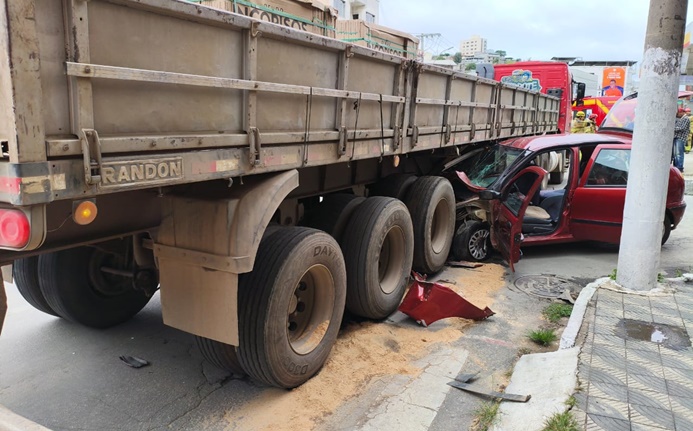 No local, o veículo Palio de cor vermelha colidiu na lateral de uma carreta , ficando o condutor do veiculo, um homem de 77 anos, preso às ferragens.