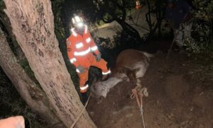 Na noite desta segunda-feira, 24 de novembro de 2025, militares do Corpo de Bombeiros de Barbacena realizaram o resgate de uma vaca que havia caído em um buraco em uma região de difícil acesso, no bairro Santa Luzia, em Barbacena.