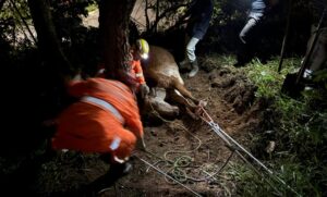Na noite desta segunda-feira, 24 de novembro de 2025, militares do Corpo de Bombeiros de Barbacena realizaram o resgate de uma vaca que havia caído em um buraco em uma região de difícil acesso, no bairro Santa Luzia, em Barbacena.