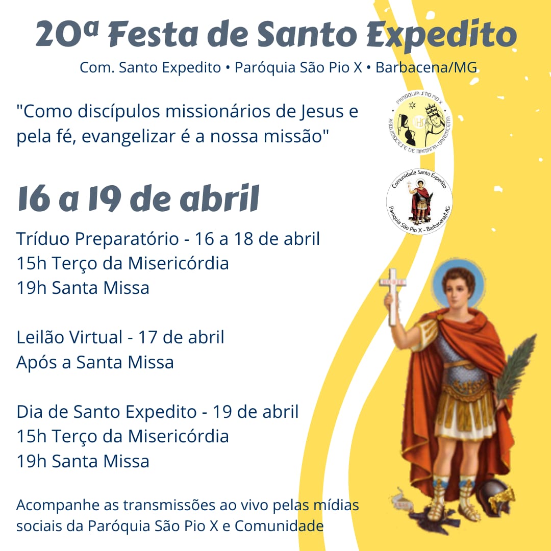 A Comunidade de Santo Expedito, pertencente à Paróquia de São Pio X, em Barbacena, celebra, entre os dias 16 e 19 de abril, a festa do padroeiro. A programação inclui o Tríduo Preparatório, nos dias 16 e 18 de abril, e a realização de um leilão virtual em 17 de abril. Todas as celebrações serão transmitidas pelo canal do YouTube da Paróquia de São Pio X e pela página no Facebook da Comunidade Santo Expedito.