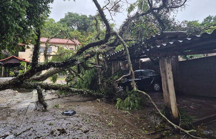 Em virtude das fortes chuvas que atingiram a região, as referidas árvores vieram a cair, atingindo parcialmente dois veículos, ocasionando avarias nos mesmos.