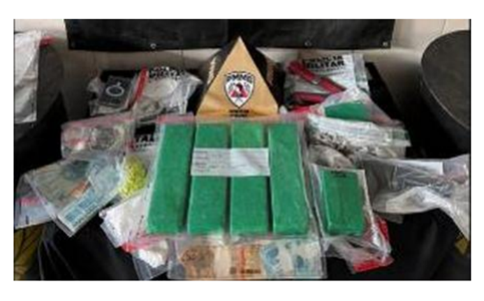 No imóvel, a equipe logrou êxito em apreender barras e buchas de maconha, porção de cocaína, comprimidos de ecstasy, anabolizantes, balanças de precisão, materiais para embalo e um simulacro de arma de fogo.