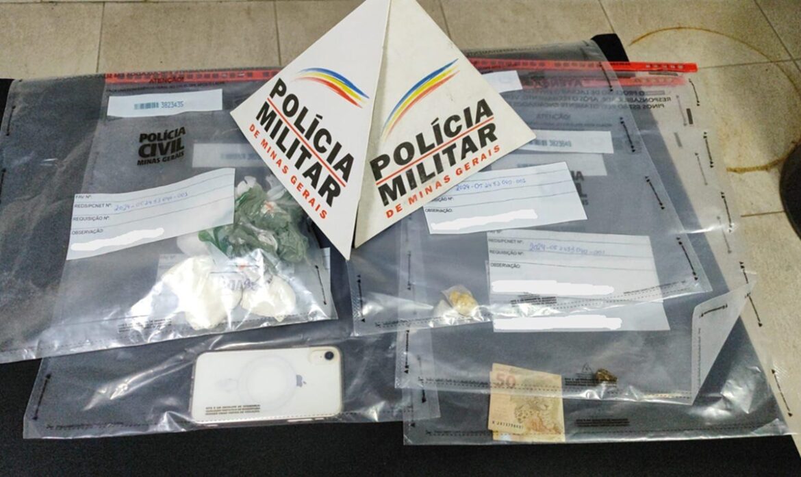 No momento da resistência, caíram do bolso do autor, um invólucro contendo substância análoga à cocaína, um invólucro contendo substância semelhante ao crack e um invólucro contendo substância análoga à maconha, além de um celular e uma cédulade R$ 50,00.