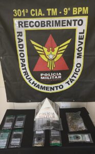 No recinto, os militares flagraram três pessoas manipulando porções de substâncias análogas a cocaína e maconha sobre um móvel.
