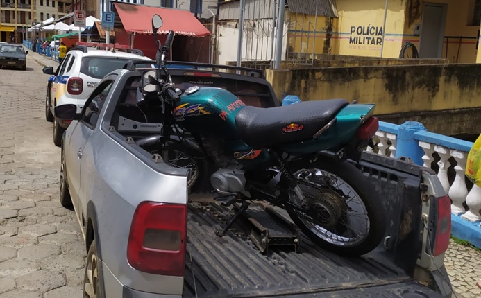 Uma motocicleta foi apreendida na manhã de sábado, 28 de fevereiro, por volta das 09h40, durante patrulhamento policial em uma rua do bairro Quebra Castanha.