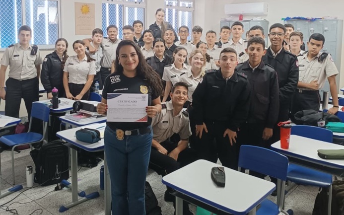 Os alunos da 1ª série do ensino médio do Colégio Tiradentes da Polícia Militar de Minas Gerais, em São João del-Rei, participaram de palestra ministrada pela investigadora da Polícia Civil de Minas Gerais, Priscila Léssia Silva, na última quinta-feira (6/11).