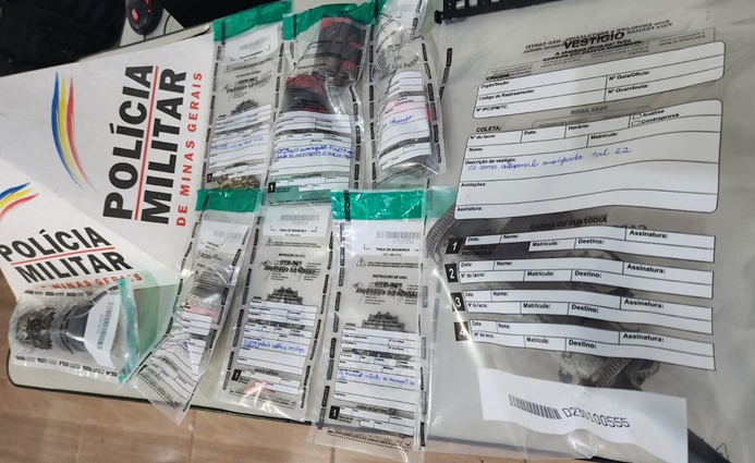 No local, o denunciado, 23 anos, conduziu os policiais até um matagal, onde foi localizada arma de fogo artesanal calibre .22, duas munições intactas, cartuchos deflagrados calibres .22, 28 e 36, além de pólvora, esferas metálicas e um pino contendo substância análoga à cocaína.