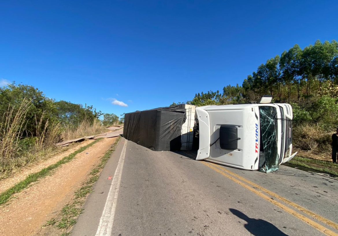 No local deparamos com um caminhão trator tombado sobre a pista, próximo a uma curva, sentido São João del-Rei.