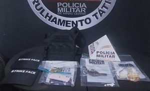 Também foi localizado 01 (um) revólver calibre .32 e 15 (quinze) munições de mesmo calibre, algumas intactas e outras percutidas, além de outras 05 (cinco) munições de calibre .38, intactas, 01 (um) colete balístico com placas de proteção e 02 (dois) aparelhos celulares.